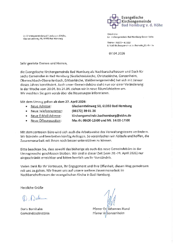 Wegen des Umzugs unseres Gemeindebüros in den Gluckensteinweg in der Woche vom 20.-24- April, bleibt das Büro während der Zeit geschlossen.